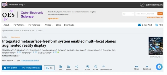 耐德佳联合顶尖科研团队实现AR多焦平面显示技术突破近日,北京耐德佳显示技术有限公司联合北京理工大学黄玲玲教授课题组、中科院物理所、新加坡国立大学等科研团队,在增强现实(AR)光学领域取得关键性进展。其研究成果《集成超表面-自由曲面系统实现多焦平面增强现实显示》作为封面文章,正式发表于光电子领域权威期刊《Opto-Electronic Science》(2026年第5卷第1期),标志着AR显示技术从“单焦时代”迈向“多焦时代”的关键一步。